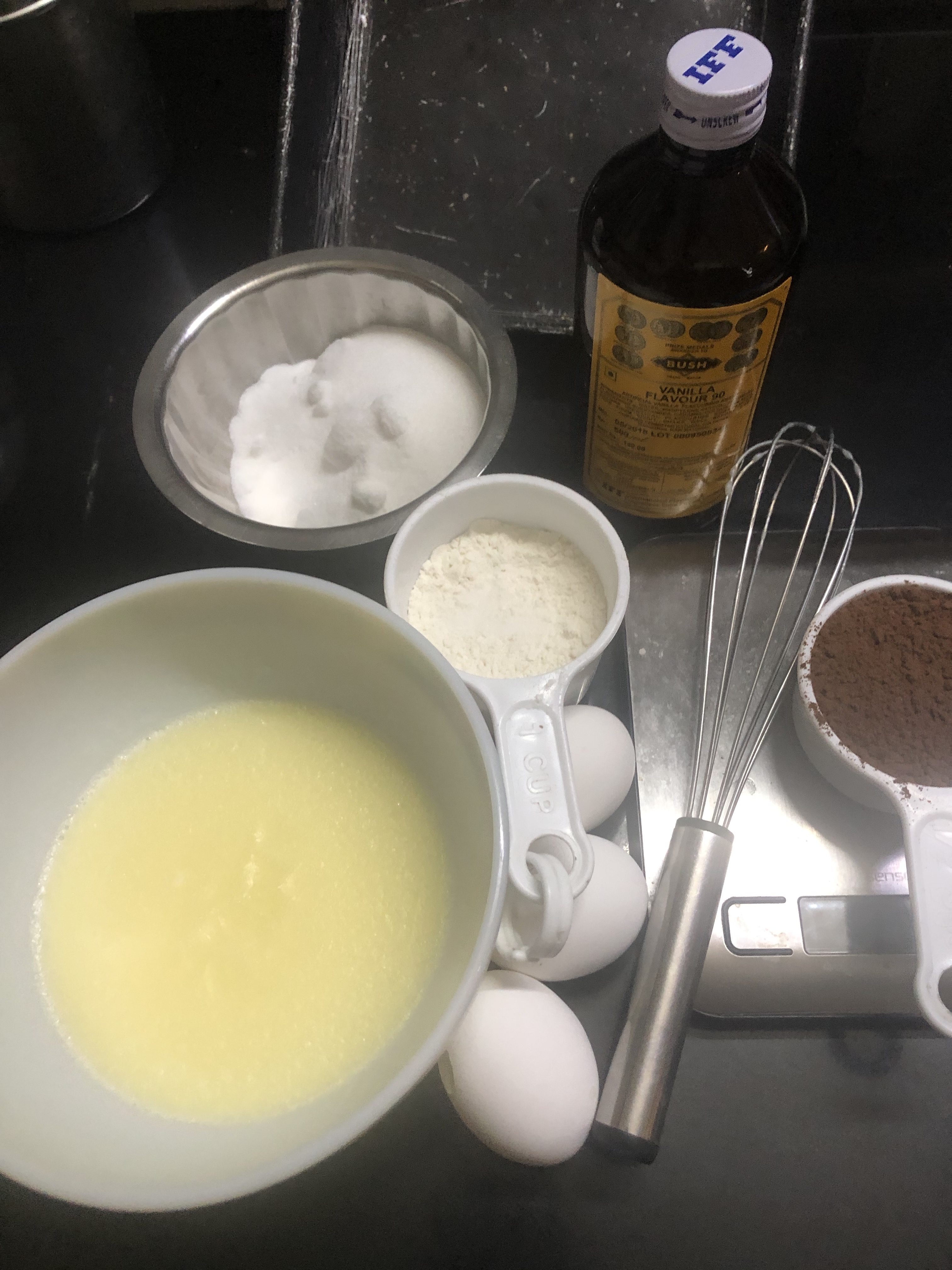 - Whisk in eggs one by one followed by sugar and vanilla essence.