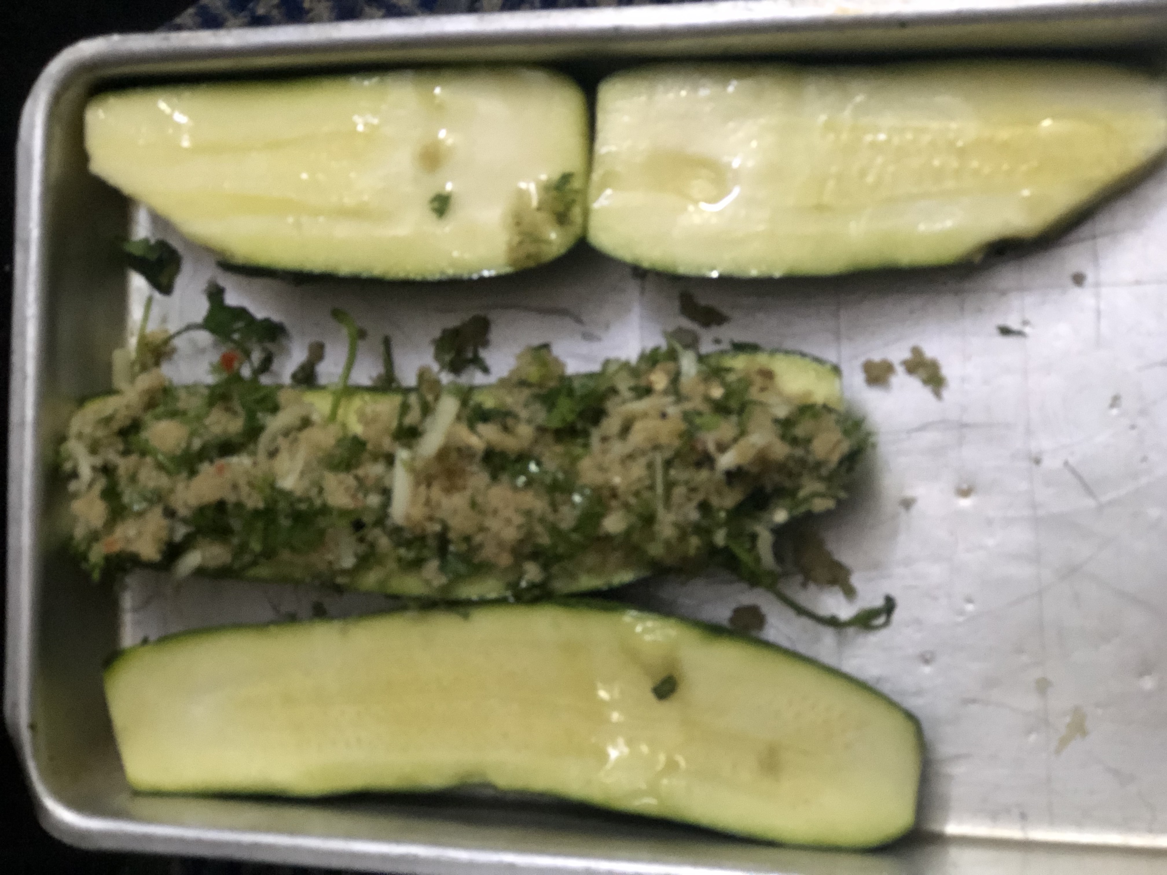 - Pile up the topping over the zucchini uniformly and bake in the oven for 15-20 minutes till the zucchini is done and the topping becomes crisp and takes golden hue.