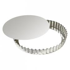 The most common tart pan and my chosen one is an aluminium or anodised one with a loose bottom base and fluted sides as it becomes very easy to un-mould. One can get them in small individual serving size called tartlet pans to a large (9”) ones called tart pans. Even metal rings are used to bake tarts. These typically have straight and short sides and no bottoms and have to be placed on flat baking sheets resulting in a much crispier bottom crusts. - Pie dish