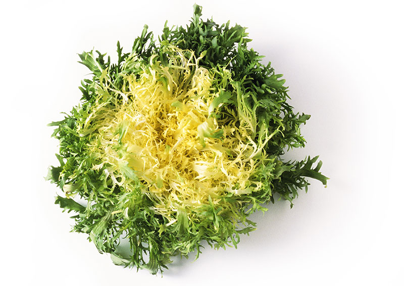 Also called lolo rosso, it is a lettuce with beautiful magenta or red leaves with frills and light green base. Just like green leaf lettuce, lolo rosso has a mild flavour and wilts very easily. - Frisee