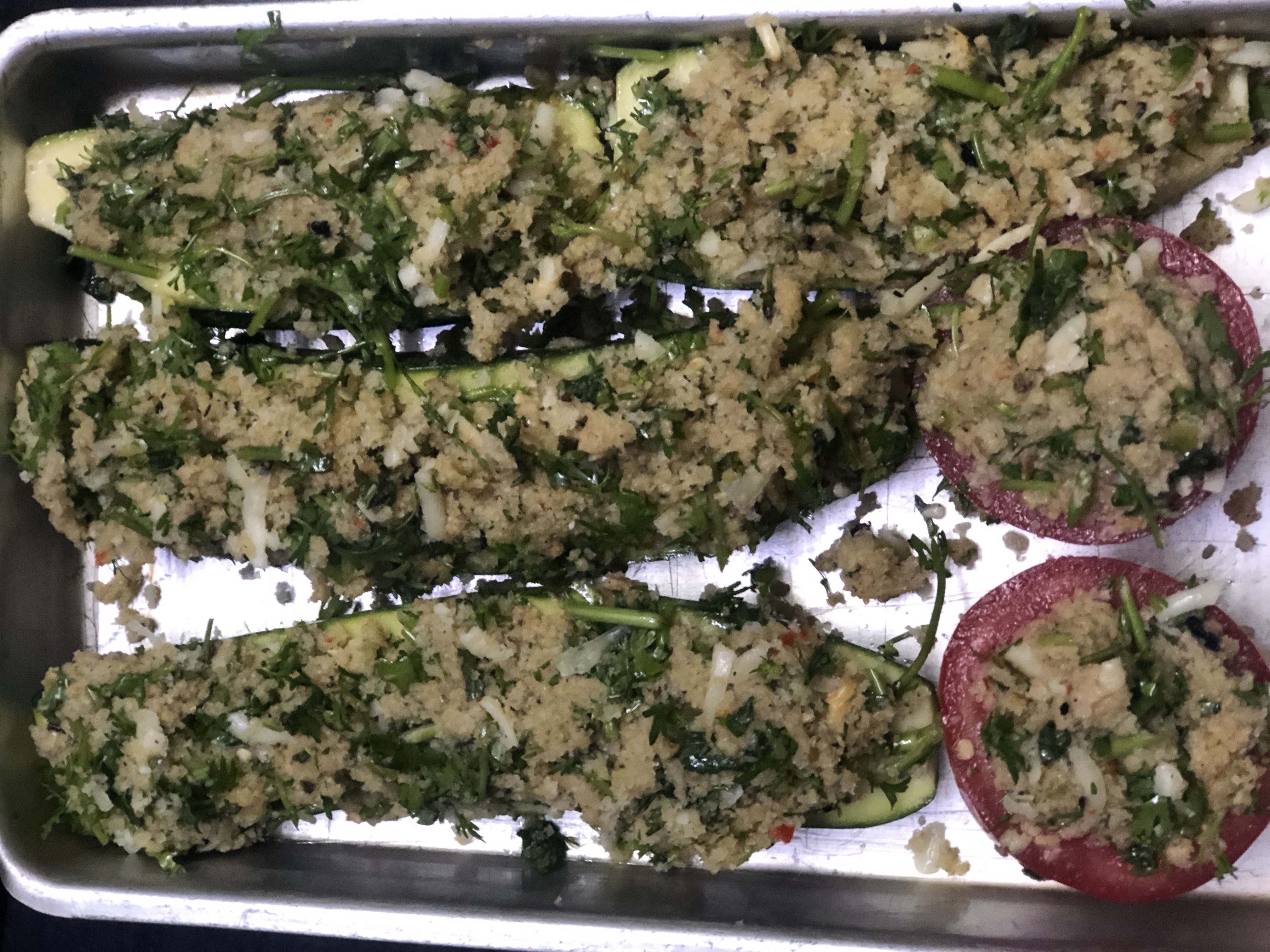 - Pile up the topping over the zucchini uniformly and bake in the oven for 15-20 minutes till the zucchini is done and the topping becomes crisp and takes golden hue.